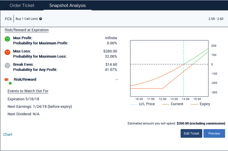 The trade breaks even if FCX is trading at $14.75 or above at expiration ($12 strike plus $2.75 option premium).