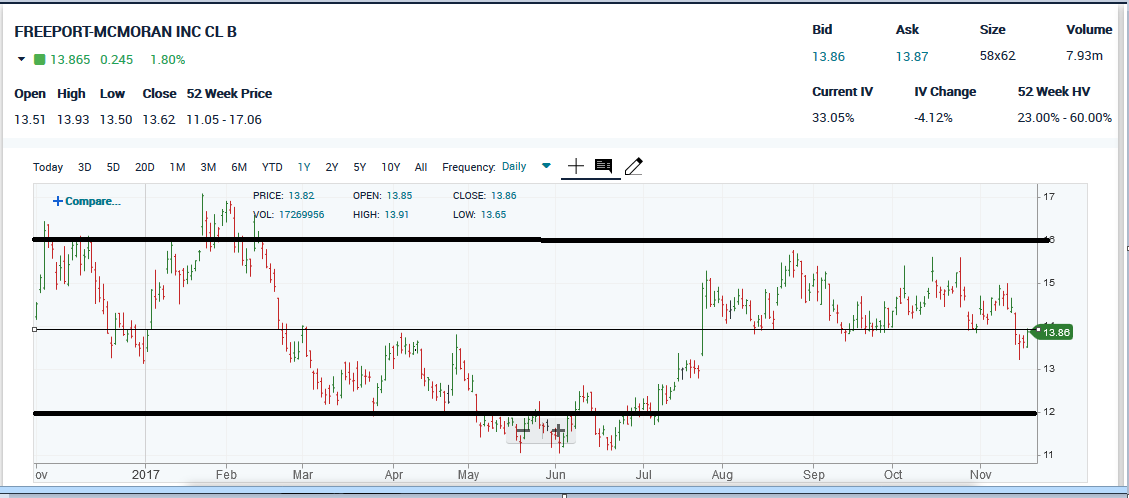 Looking at FCX, the $12 option strike level corresponds with the bottom of the trading channel.  This In The Money option gives you the right to buy at a level lower than the present price with absolutely limited risk.