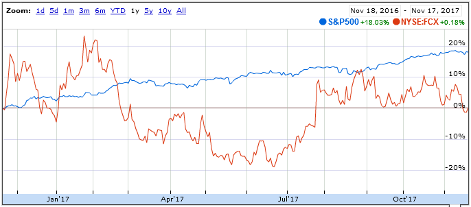The broad market barometer S&P is up an impressive 15% YTD and making another push to the peak.   Compare that to Freeport McMoran that has stalled over the last year but offers a good reward to risk at these levels for bullish buyers.